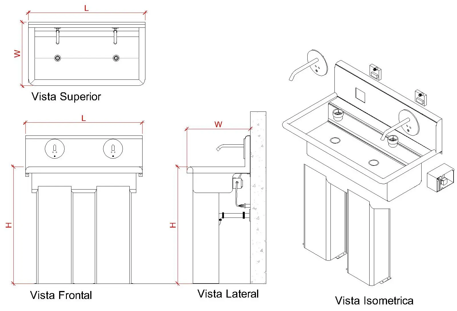 Lavamanos con pedestal fabricado en acero inoxidable. Poceta fabricada en lámina de 1.5mm con angulares para anclaje a pared. Pedestal fabricado en lámina de 0.8mm con perforaciones para anclaje a piso. Incluye grifo de sensor infrarrojo a batería o corriente 220V y canasta retenedora de sólidos. No incluye mangueras de abasto, accesorios de PVC, instalación ni trabajos de plomería.
